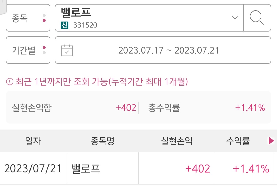 매수는 총 2번 20주 매수했으며 실현손익은 +402원, 수익률은 1.41%입니다. 2번째 매수하면서 목표 수익률을 2%에서 1.5%로 낮췄고 두 번째 매수 후 하락해서 세 번째 매수 지점 부근까지 하락했다가 상승해서 수익 실현했습니다.