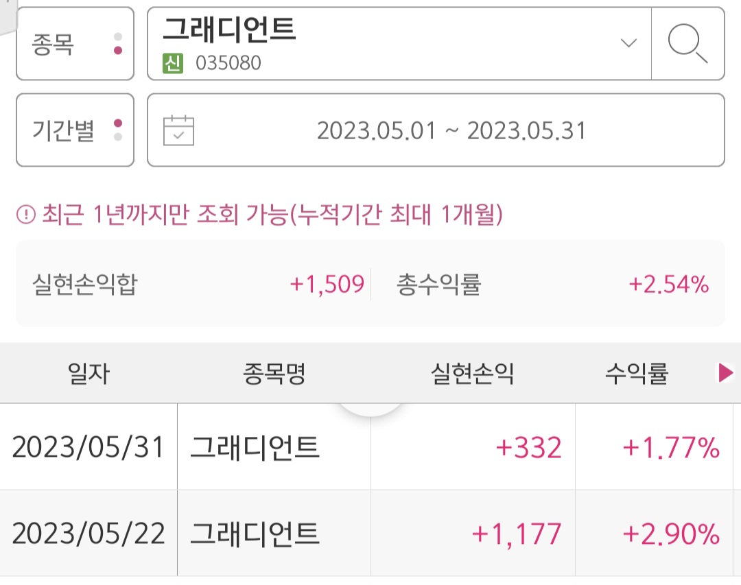 첫 번째 매매로 1,177원의 익을 올렸고 두 번째 매매로 332원의 수익을 올렸습니다. 실현손익 합은 +1,509원입니다. 총수익률은 +2.54%입니다. 스윙 투자 목표 수익률인 3%가 되지 않습니다. 3%의 수익률을 올리는 게 쉬운 일이 아님을 느낍니다.