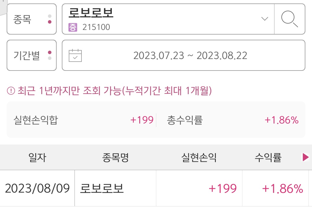 첫 매수 후 다음 날 상승해서 추가 매수 없이 매도했습니다. 실현손익 199원으로 수익률은 1.86%입니다. 목표 수익률인 2%에 조금 못 미치는 수익률입니다.