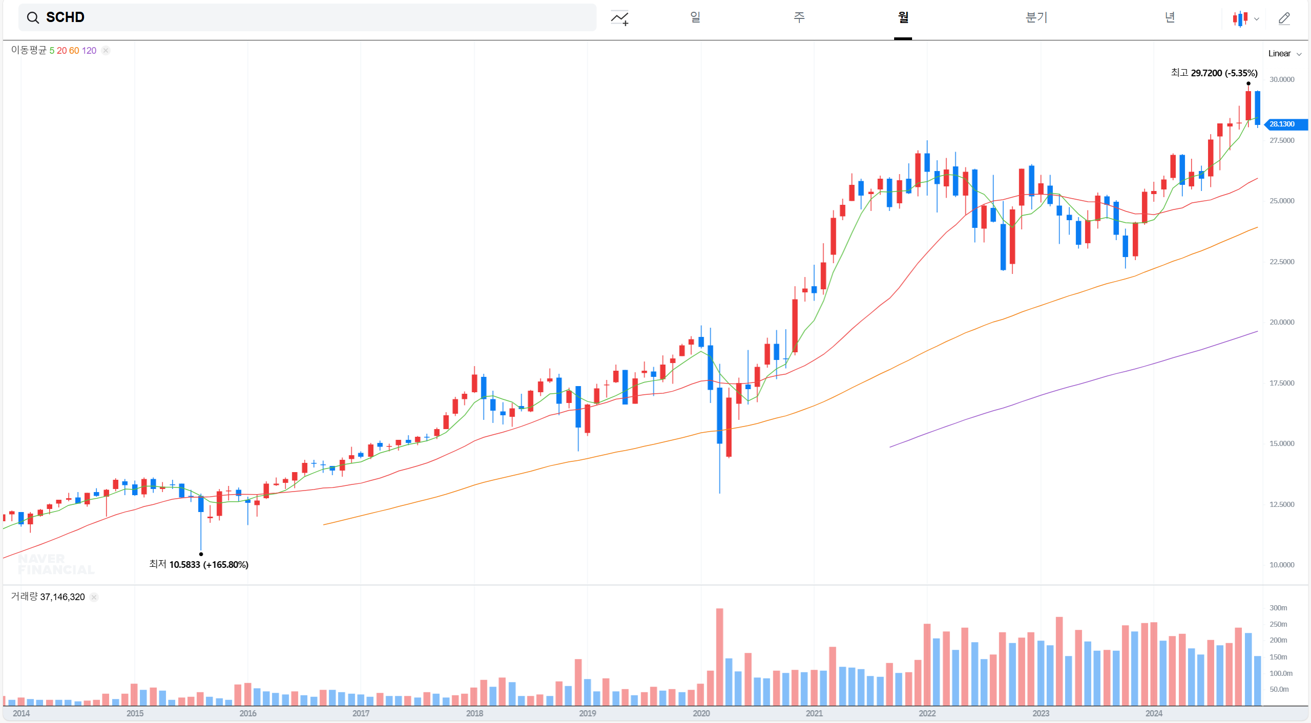 SCHD 10년 월간 차트를 보면 우상향하고 있습니다.