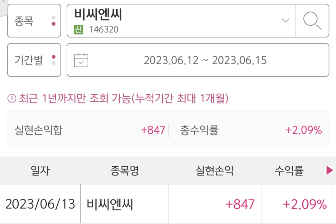 어쨌든 분할 매도를 했으면 조금 더 많은 수익을 올릴 수 있었는데 조금 아쉬움이 남습니다. 그리고 반성합니다. 마지막으로 비씨엔씨 수익률은 +2.09%로 실현손익은 +847원입니다.