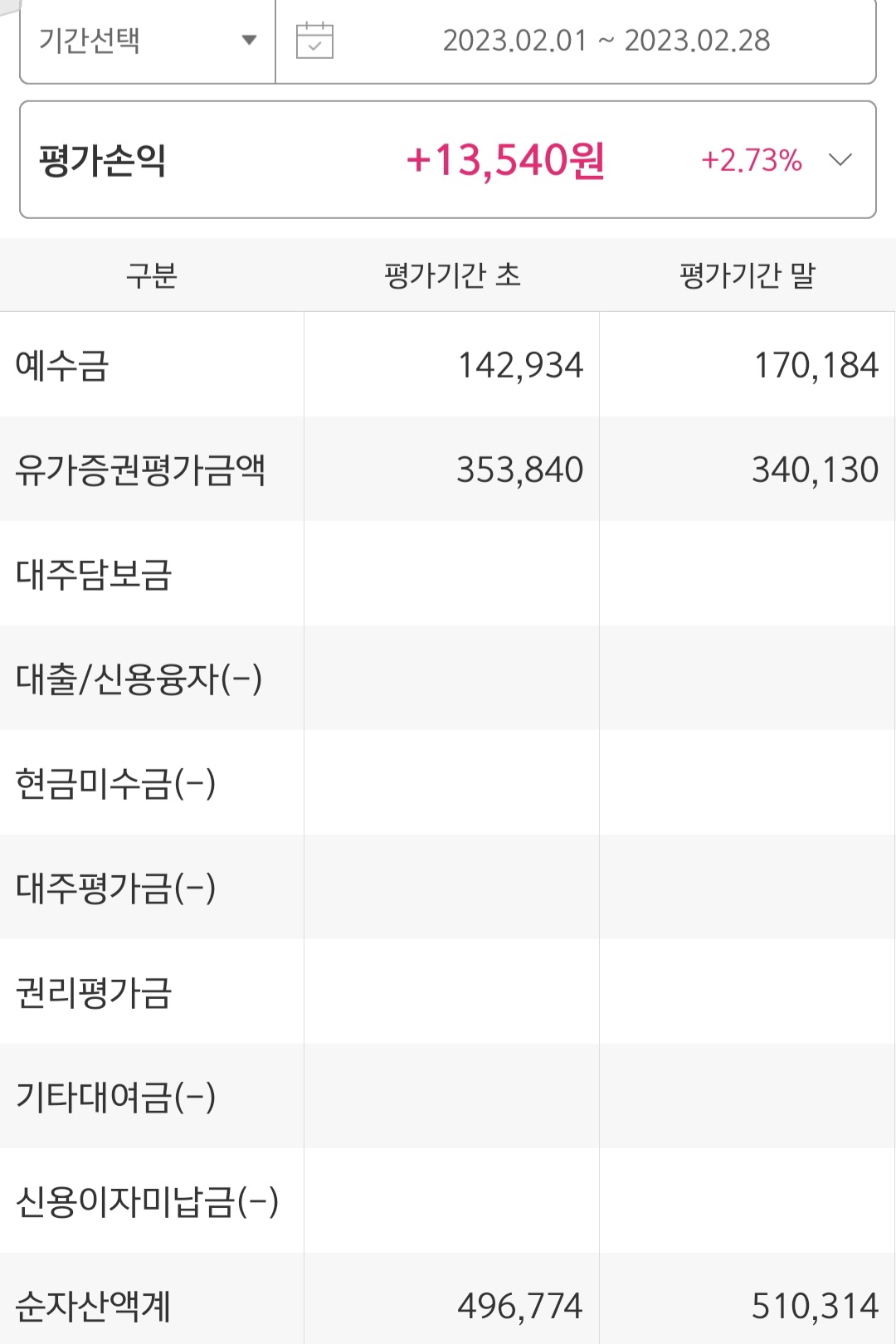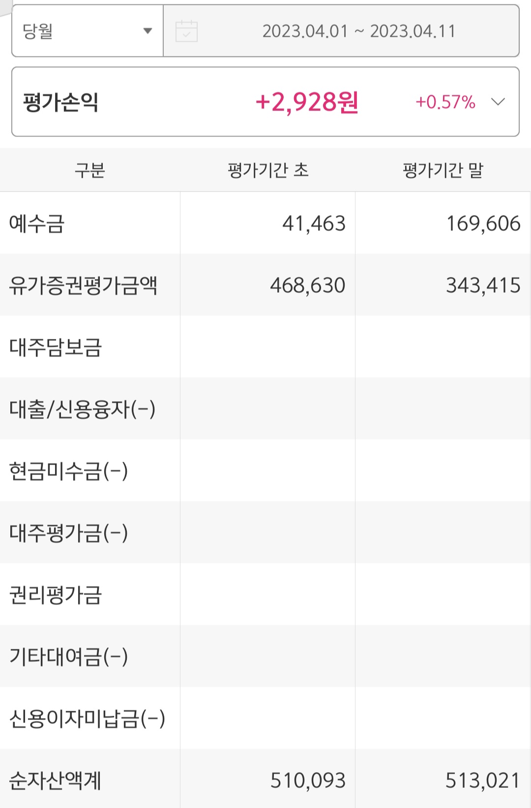 23년 현재까지 월별 손익입니다. 매일 바뀌는 자산액이라 큰 의미는 없지만 어쨌든 1월 465,068원으로 시작해서 지금은 513,021원입니다. 22년 손실은 일단 메웠습니다. 물론 내일 손실이 될 수도 있지만 어쨌든 지금은 13,021원 플러스입니다.