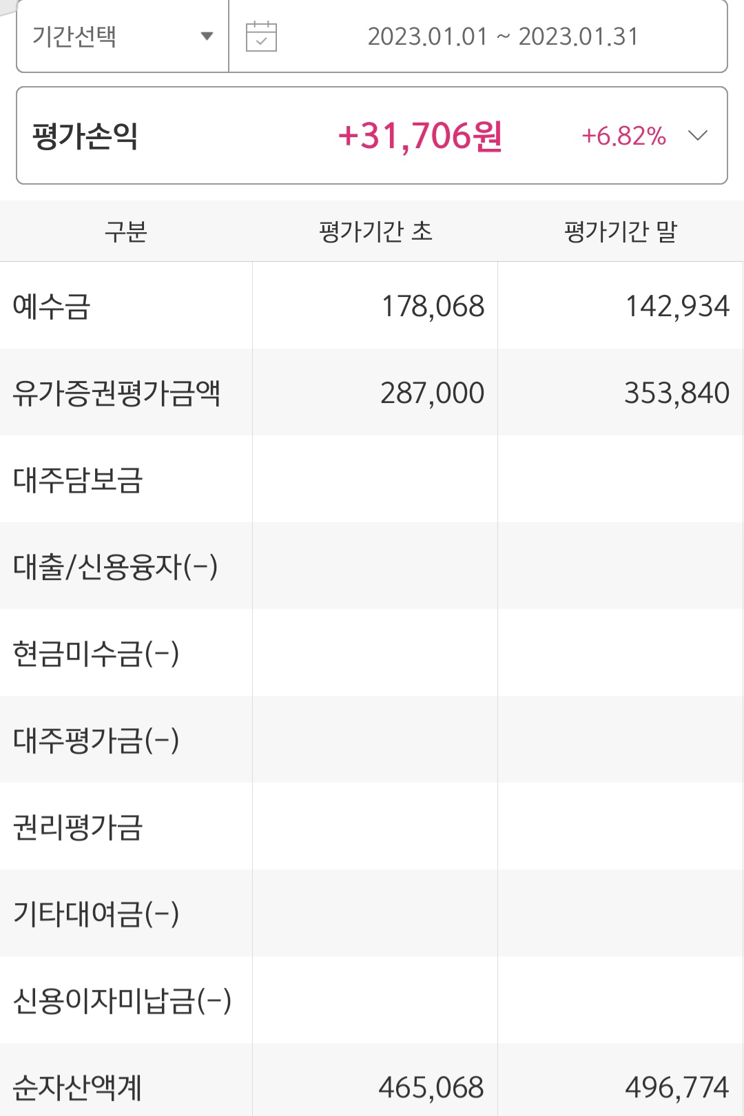 23년 현재까지 월별 손익입니다. 매일 바뀌는 자산액이라 큰 의미는 없지만 어쨌든 1월 465,068원으로 시작해서 지금은 513,021원입니다. 22년 손실은 일단 메웠습니다. 물론 내일 손실이 될 수도 있지만 어쨌든 지금은 13,021원 플러스입니다.