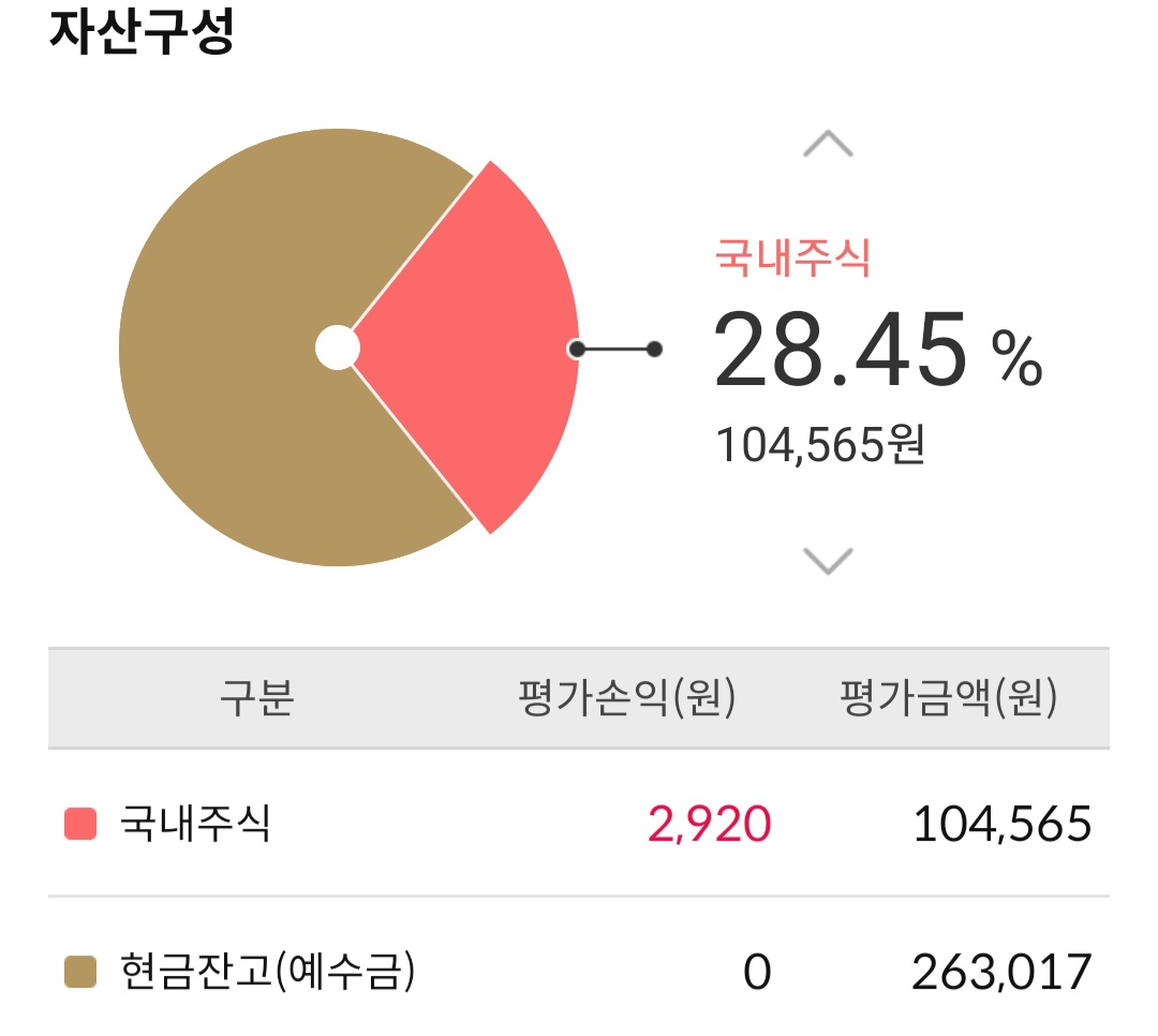 국내주식 104,565원과 현금잔고 263,017원으로 아직 주식 보유보다 현금 보유가 많습니다. ETF투자 계좌이니 당연히 여기서 국내주식은 ETF입니다. 현재 보유 종목은 KODEX 200, KODEX 은행, TIGER 원유선물,KODEX 골드선물, KODEX 3대농산물선물 입니다. 앞으로 매수, 매도할 때 사고 판 이유들도 기록으로 남겨놓아야겠습니다.