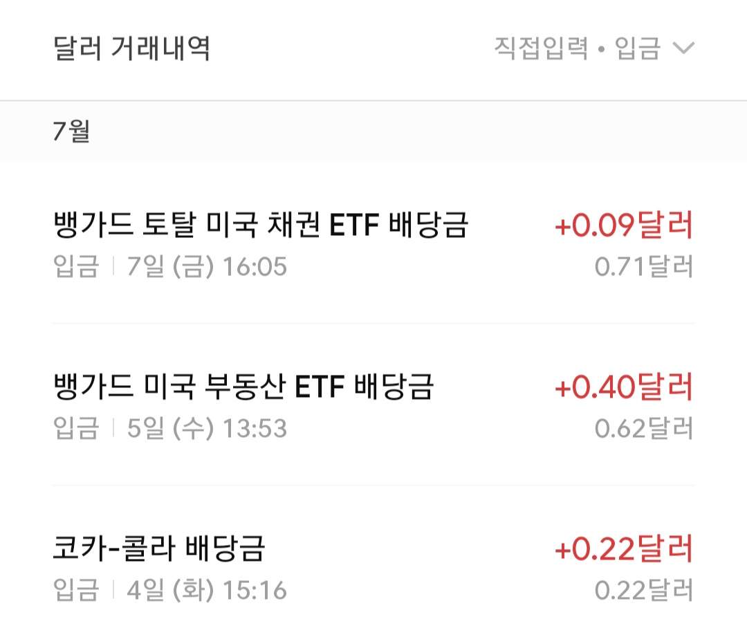 7월 배당은 뱅가드 토탈 미국 채권 ETF, 뱅가드 미국 부동산 ETF, 코카콜라에서 받았습니다. 금액들은 아주 소액이지만 그래도 매달 배당을 받고 있습니다. 7월 배당금은 총 0.71달러입니다.