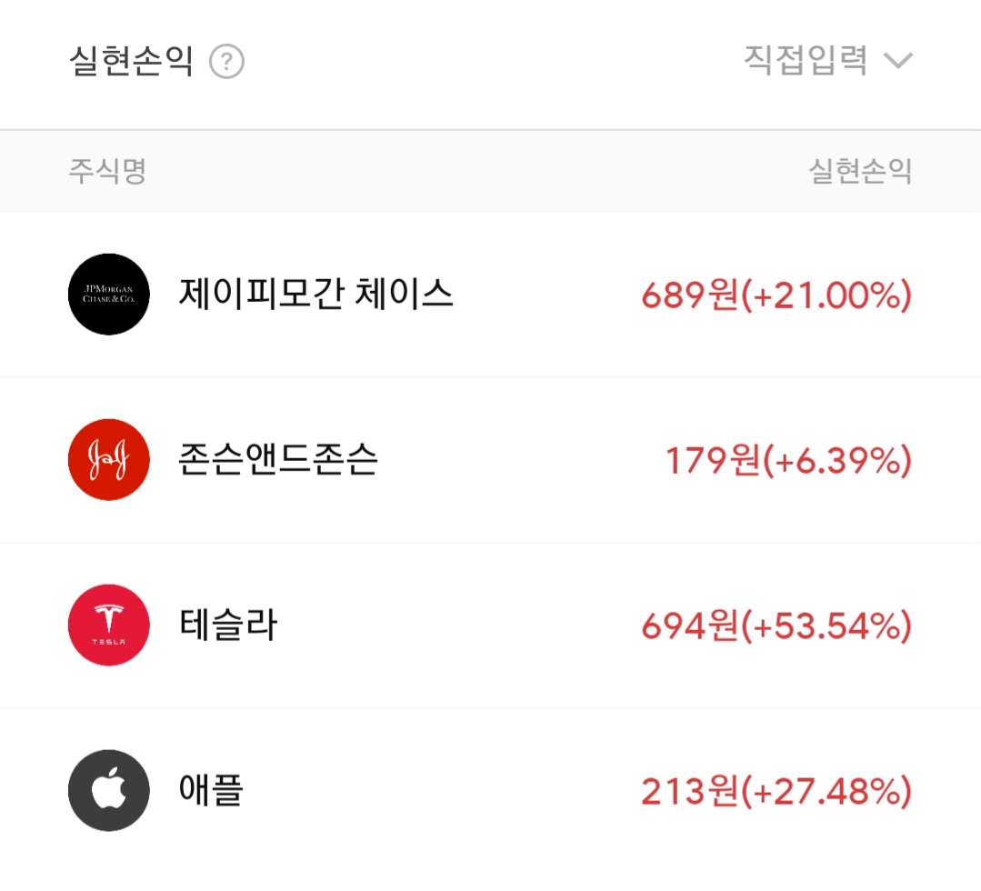 7월 한 달 실현손익은 1,775원으로 테슬라, 제이피모간 체이스, 애플, 존슨앤드존슨 종목에서 수익을 올렸습니다. 수익률과 금액 모두 테슬라가 가장 높았습니다. 참고로 7월엔 손실이 없었습니다. 보유 주식 하락으로 총자산은 줄었지만 실현손익은 플러스입니다.