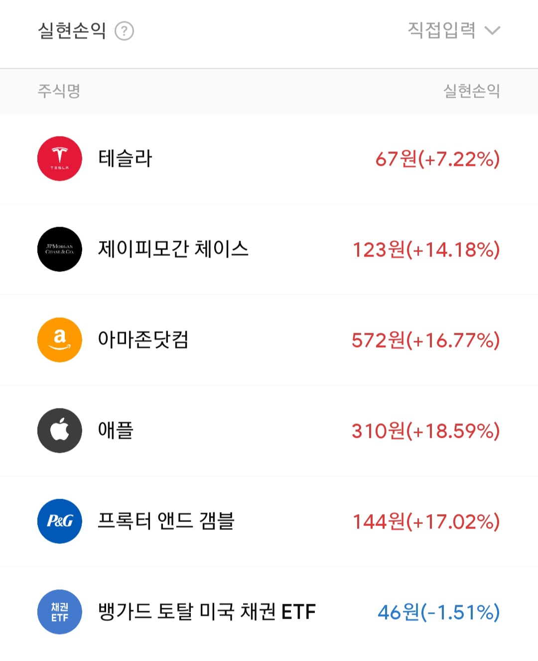 보유 종목은 총 9개로 코카콜라, 프록터 앤드 갬블, 존슨앤드존슨,테슬라, 제이피모간 체이스,애플,아마존닷컴 개별 종목 7개와 뱅가드 토탈 미국 채권 ETF, 뱅가드 미국 부동산 ETF 2개입니다. 개별 종목은 존슨앤드존슨을 제외하면 모두 플러스 상태입니다. 반면 ETF 2개는 모두 마이너스 상태입니다.