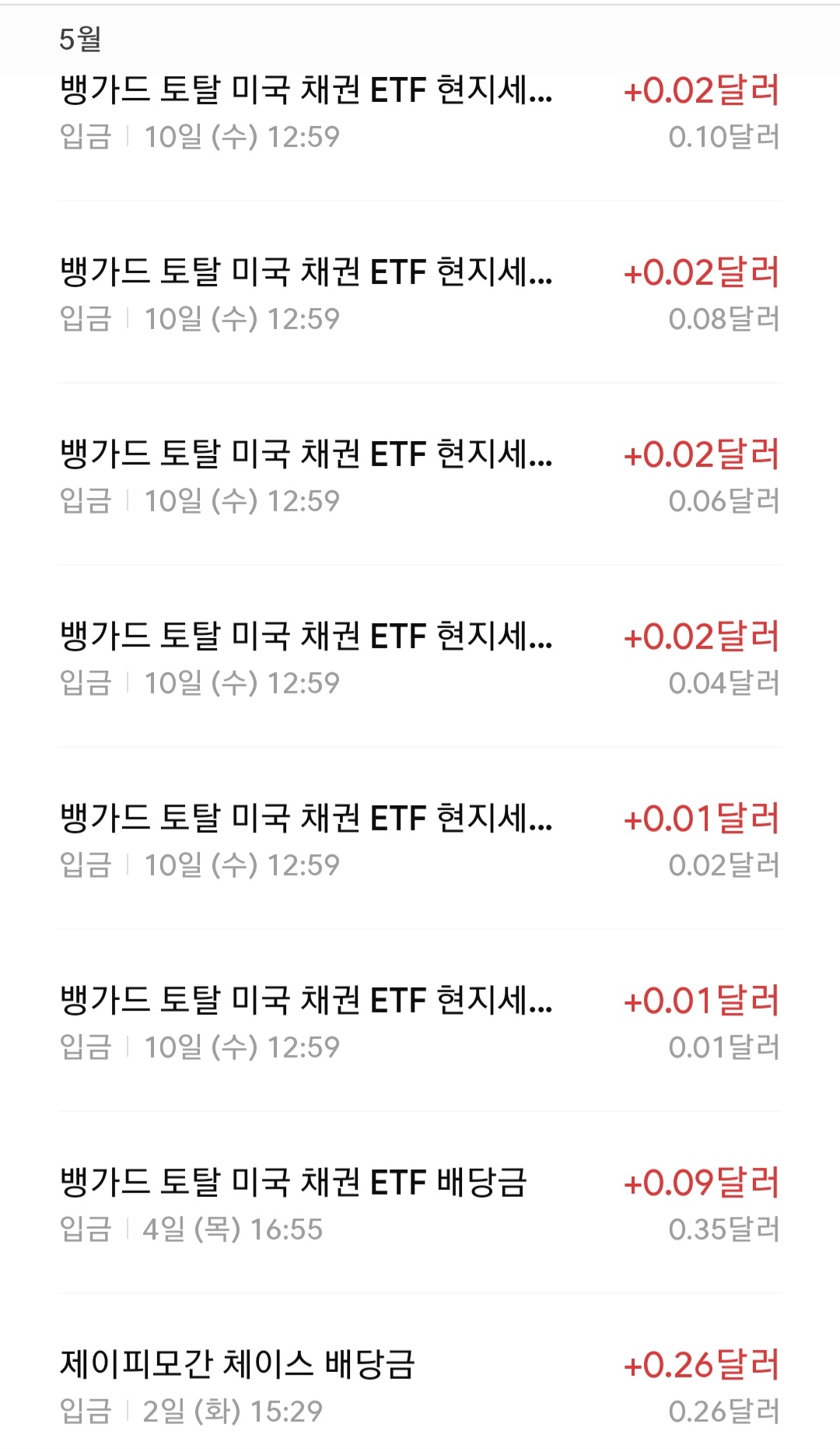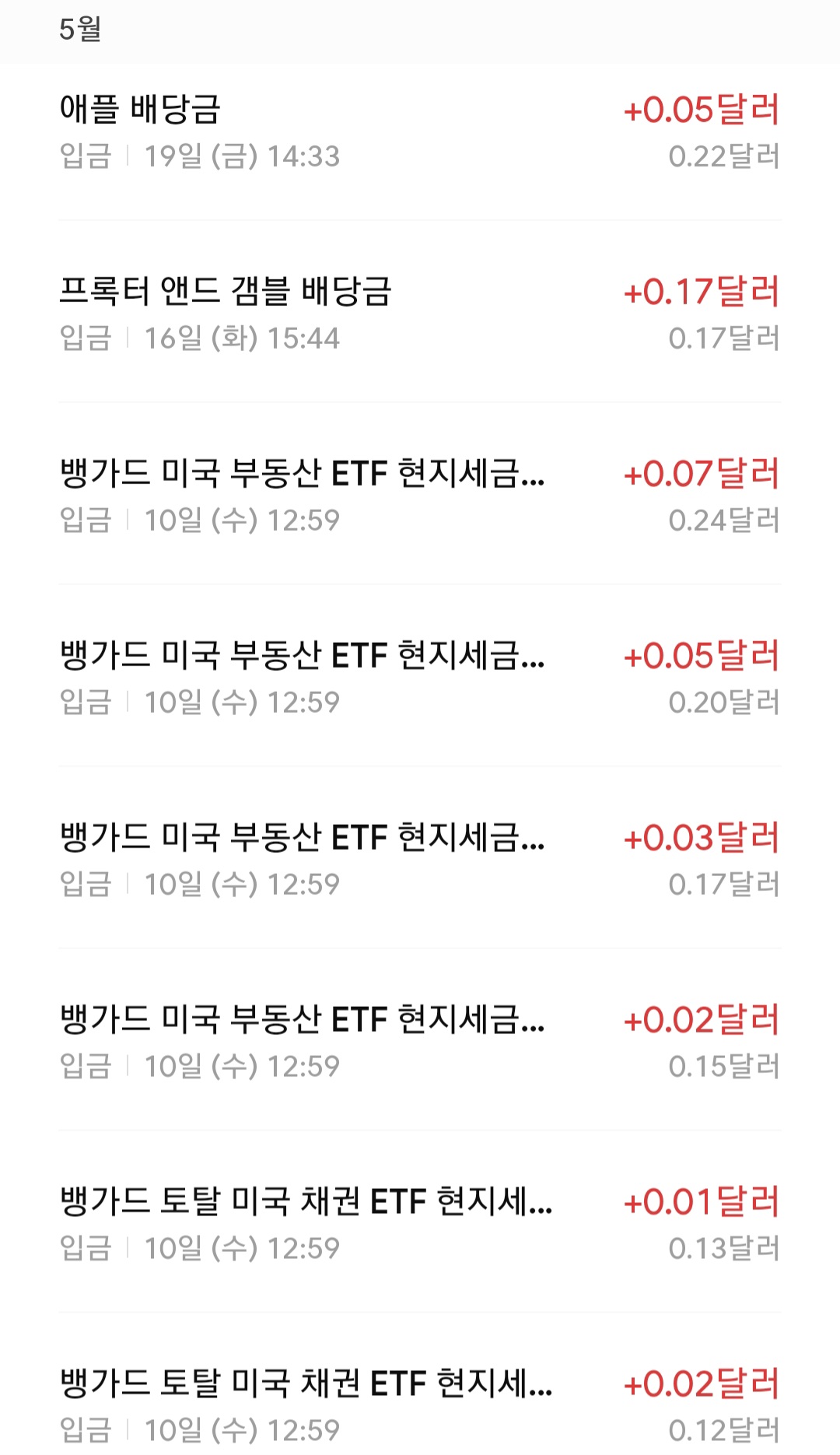 현지 세금 환급은 제외하고 배당금은 뱅가드 토탈 미국 채권 ETF 배당금 0.09달러, 제이피모간 체이스 배당금 0.26달러, 애플 배당금 0.05달러, 프록터 앤드 갬블 배당금 0.17달러로 총 0.57달러입니다. 배당금은 배당이 들어온 주 금요일에 환전해서 원화로 정확히 얼마인지는 모르겠으나 대략 700원쯤 될 듯합니다.