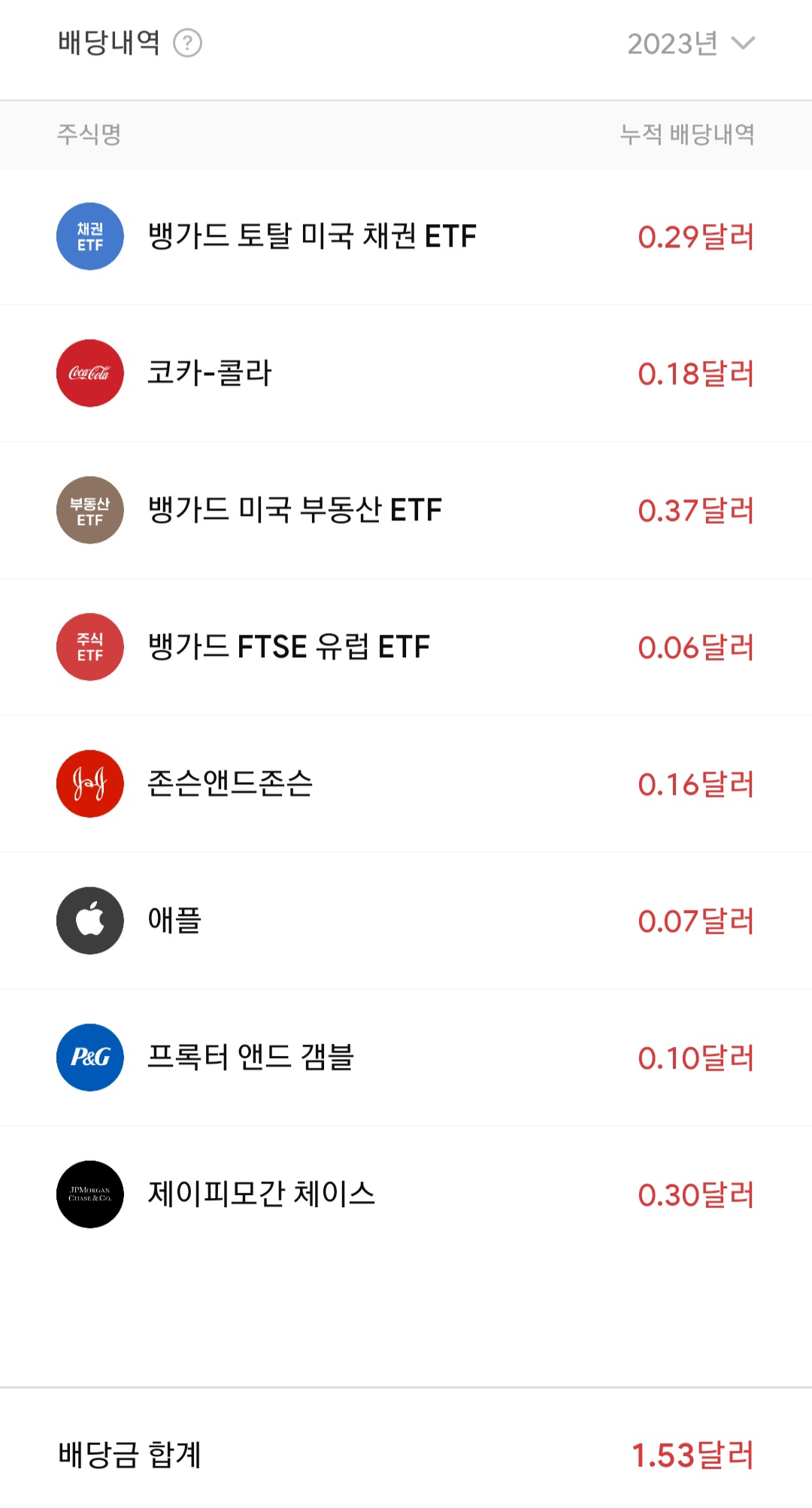 배당금 조회는 직접 기간 설정이 안돼서 23년 총 받은 배당금으로 1.53달러입니다. 배당금은 받으면 바로 환전해서 원화로 얼마인지는 정확히 알 수 없습니다. 대충 4월 평균 환율로 계산하면 될 듯도 한데 굳이 하지는 않겠습니다. 5월 배당금은 이번 기록이랑 비교를 하면 되니 알 수 있습니다.
