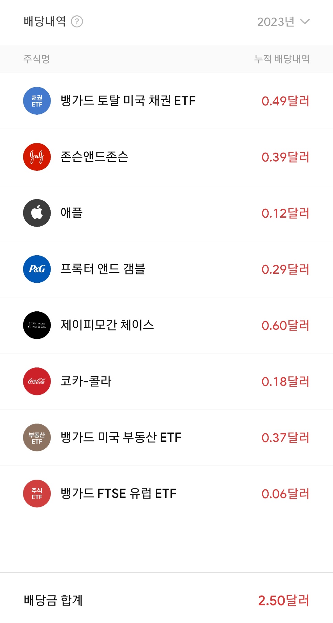 상반기 받은 배당은 2.50달러입니다. 받은 배당은 그 주 금요일에 원화로 환전하기 때문에 원화로 정확히 계산하기 어렵습니다. 그냥 상반기 평균 환율로 계산하면 될 듯하지만 굳이 계산하지는 않겠습니다. 총 8종목에서 배당받았으며 가장 많은 배당은 제이피모간 체이스 0.6달러입니다.