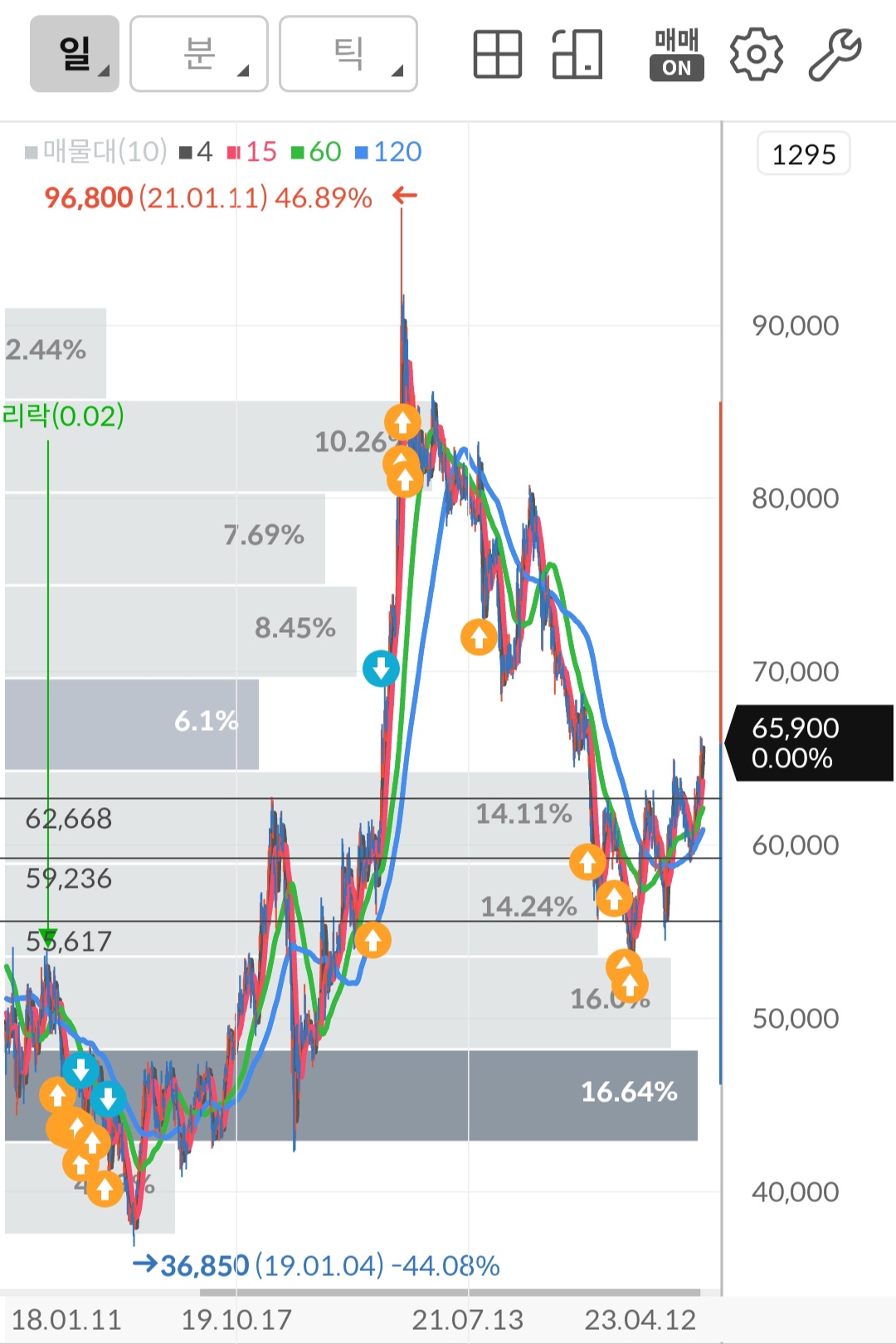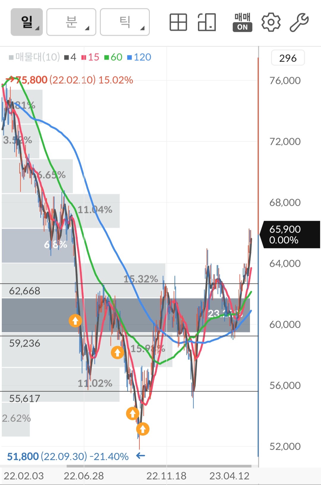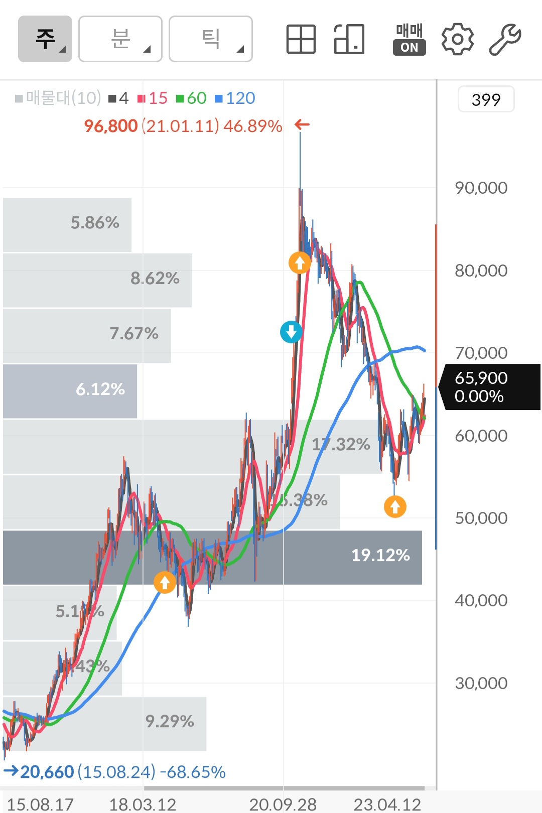 현재 평균 매수 단가는 67,920원으로 캡처할 당시 수익률은 -2.97%로 -20,200원입니다. 아래 차트를 보면 알겠지만 고점에서부터 매수를 시작했습니다. 10만 전자 10만 전자 할 때 진짜 10만원 가는 줄 알고 매수했습니다. 그리고 배웠습니다. 뉴스나 전문가들이 하는 말 듣지 말고 내 방식, 내 성향대로 투자해야겠다고 말이죠. 왜냐 적어도 내가 공부하고 투자하면 억울하지도 않고 거기서 배우는 게 있기 때문입니다.