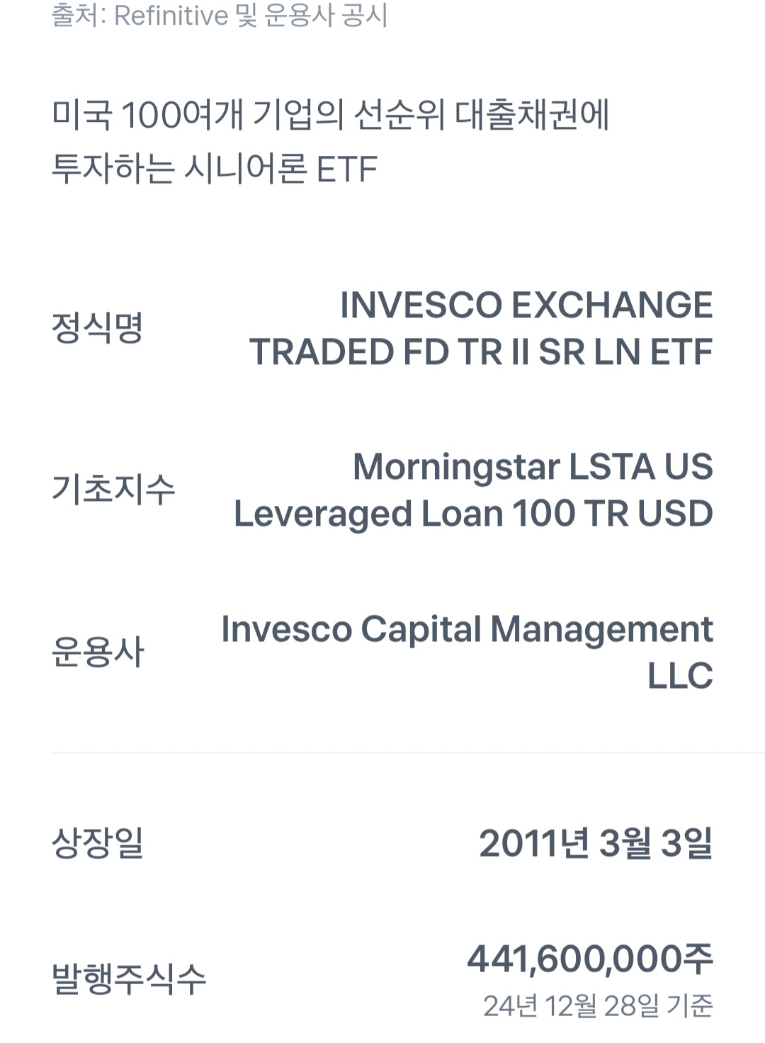 BKLM 정식명은 INVESCO EXCHANGE TRADED FD II SR LN ETF로 미국 100여 개의 기업 선순위 대출채권에 투자하는 시니어론 ETF입니다.