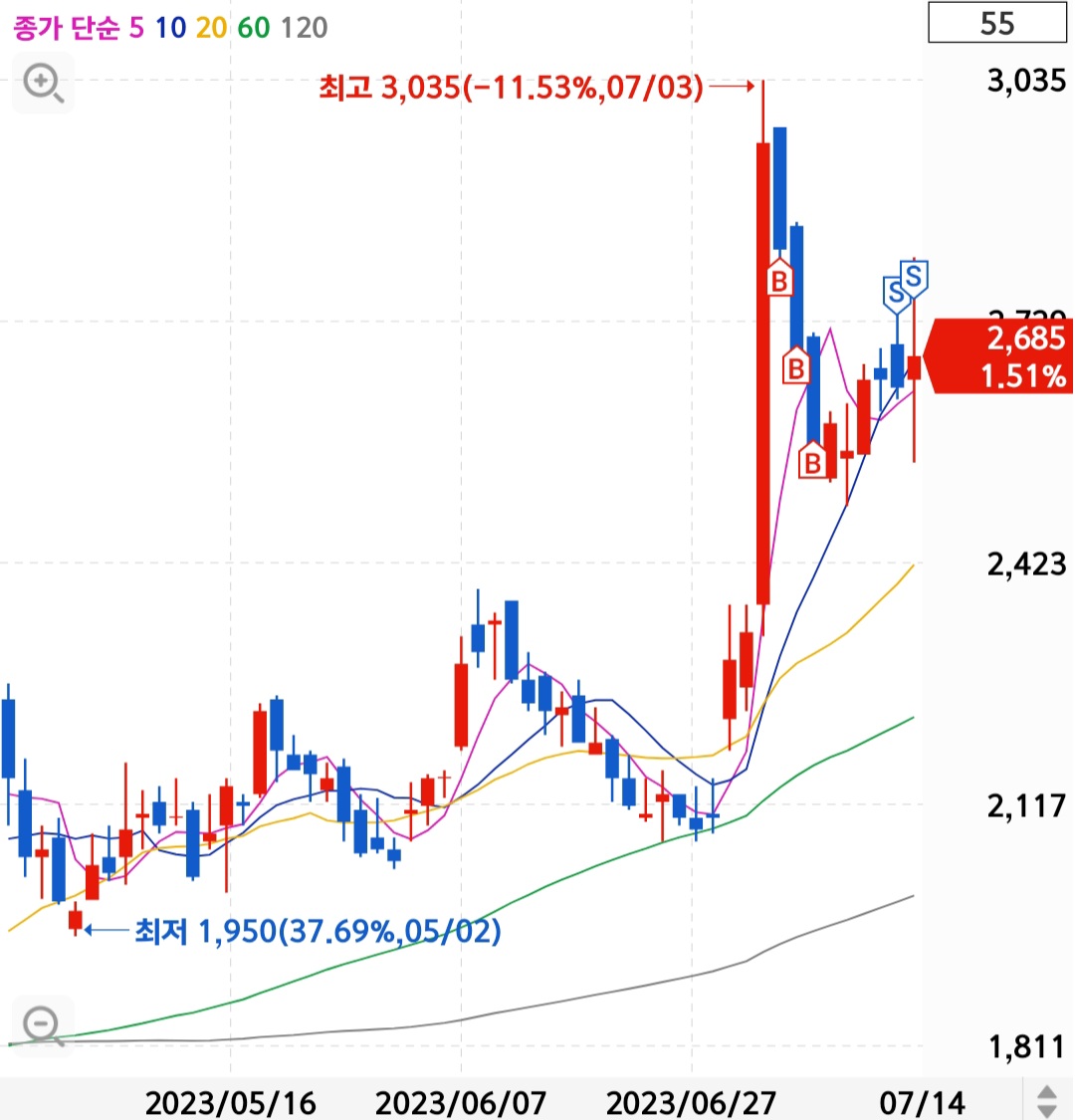 1차 매매하기로 결정하고 급등한 다음 날 흐름을 보고 첫 매수를 할 생각이었습니다. 매수는 최대 20주로 첫 매수 후 하락 시 4주씩 나누어서 매수한다는 계획이었고 목표 수익률은 3%였습니다. 목표 수익률인 3% 이상 상승 시 상황을 보고 전량 매도, 급등한 날 최저가 보다 하락하면 손절매한다는 계획이었습니다.