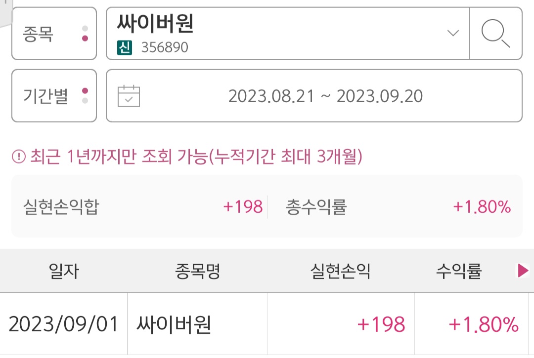 싸이버원 매매기록 및 주가 : 수익률 1.80%