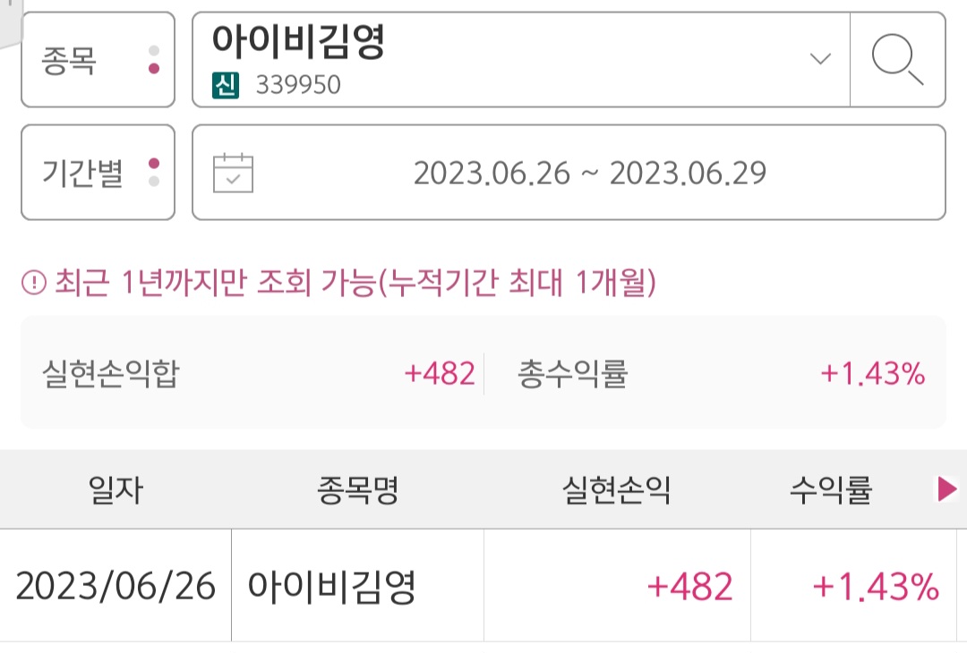 매수는 총 3번 15주 매수했으며 수익률은 +1.43%로 실현손익은 +482원입니다.