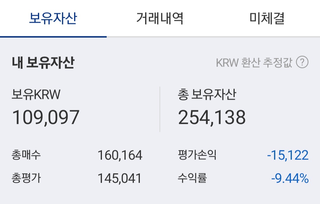 보유 원화는 109,097원이고 보유 코인은 총매수 160,164원인데 현재 평가금액은 145,041원으로 -9.44% 수익률입니다. 평가손익이 -15,122원임에도 투자원금보다 4,138원이 많으니 지금 보유자산을 전부 매도해도 손실은 아닙니다.