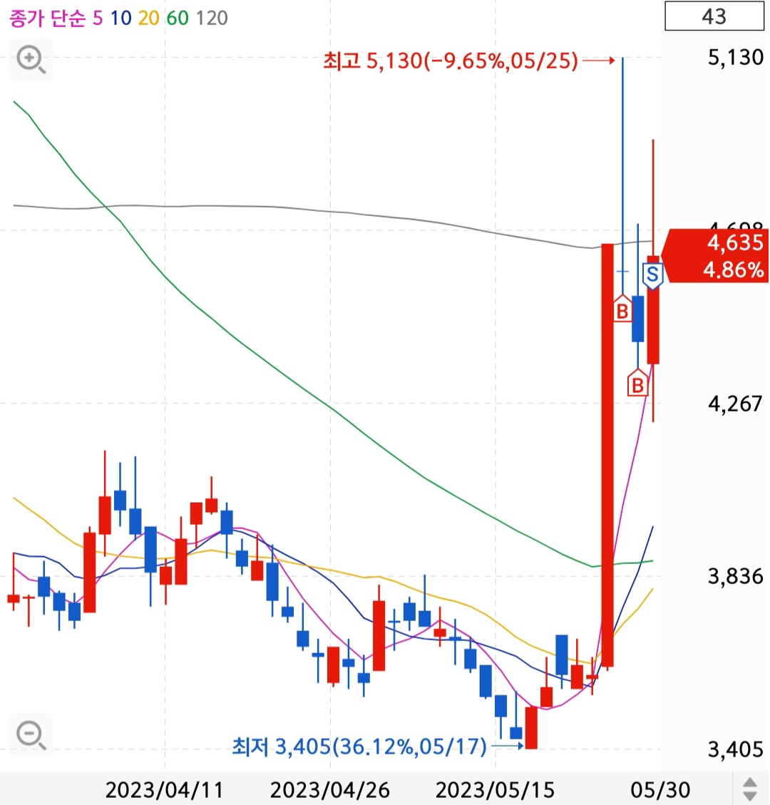 23년 5월 24일 중국 신종 코로나19 신규 확진자 급증으로 인한 산소호흡기 관련주 그리고 우크라이나 비살상무기 지원 수혜주식으로 거론되면서 급등했습니다. 재료가 하나가 아니라 두 개입니다. 개인적으로 우크라이나 비살상무기 지원이 급증을 이끈 것 같습니다. 코로나가 다시 전 세계적으로 이슈가 되지 않는 한 큰 재료가 될 것 같지는 않습니다. 물론 개인적인 생각입니다.