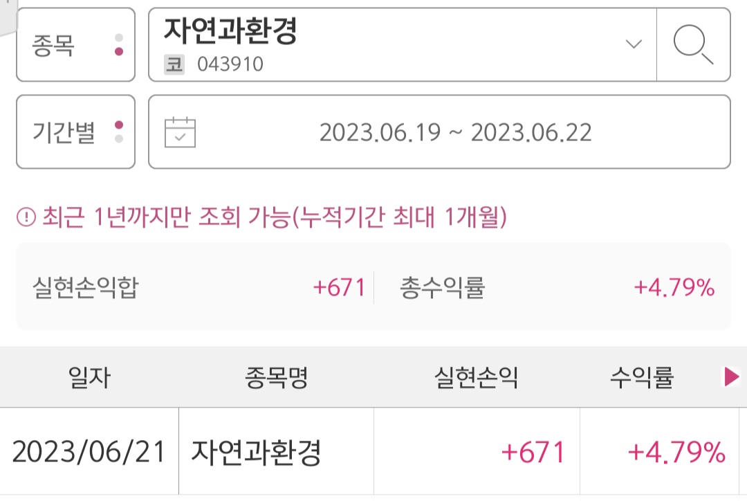 종가 부근에서 매수할 생각에 3시쯤에 첫 매수를 했는데 조금 상승해서 마감했습니다. 그리고 매수한 다음 날 추가 매수 없이 수익 실현했습니다. 수익률은 +4.79%로 목표 수익률을 넘겼습니다. 실현손익은 +671원입니다.