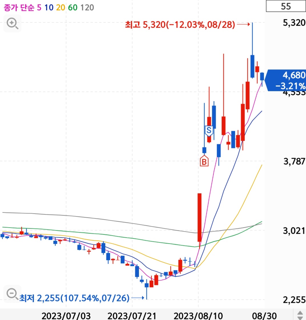 이전에 포스팅한 토니모리와 같은 생각으로 1차 매매를 결정했습니다. 목표 수익률은 2%로 정하고 손절 라인은 급등한 날의 일봉 절반 정도로 정했습니다. 매수는 3주씩 최대 5번까지 나누어서 한다는 계획이었습니다. 최대 매수 수량은 15주였습니다.