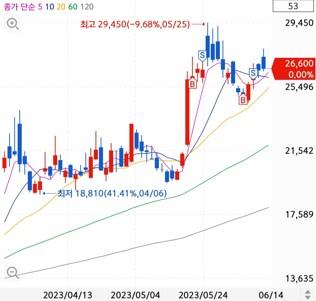 10일선과 20일선 사이에서 지지 라인을 만들었다고 보기는 어렵지만 재료가 좋아서 20일선 부근에서 매수를 결정했습니다. 물론 분봉을 보면 어느 정도 지지 라인이 형성되어 있기도 했고 과거 흐름을 봤을 때 20일선을 타고 움직이는 경우가 있었습니다.