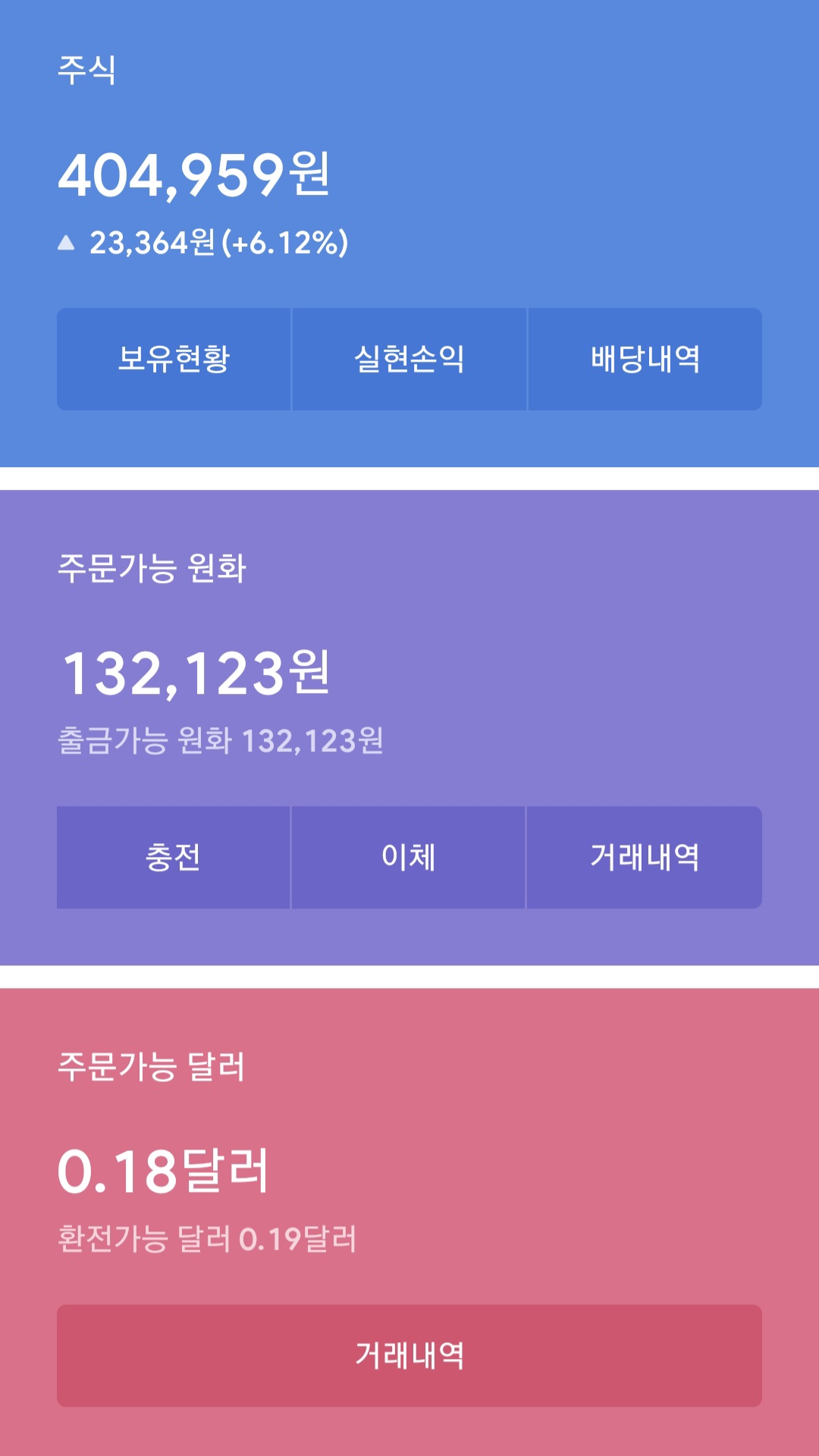 총자산은 주식보유 404,959원, 원화 132,123원 그리고 0.18달러입니다.