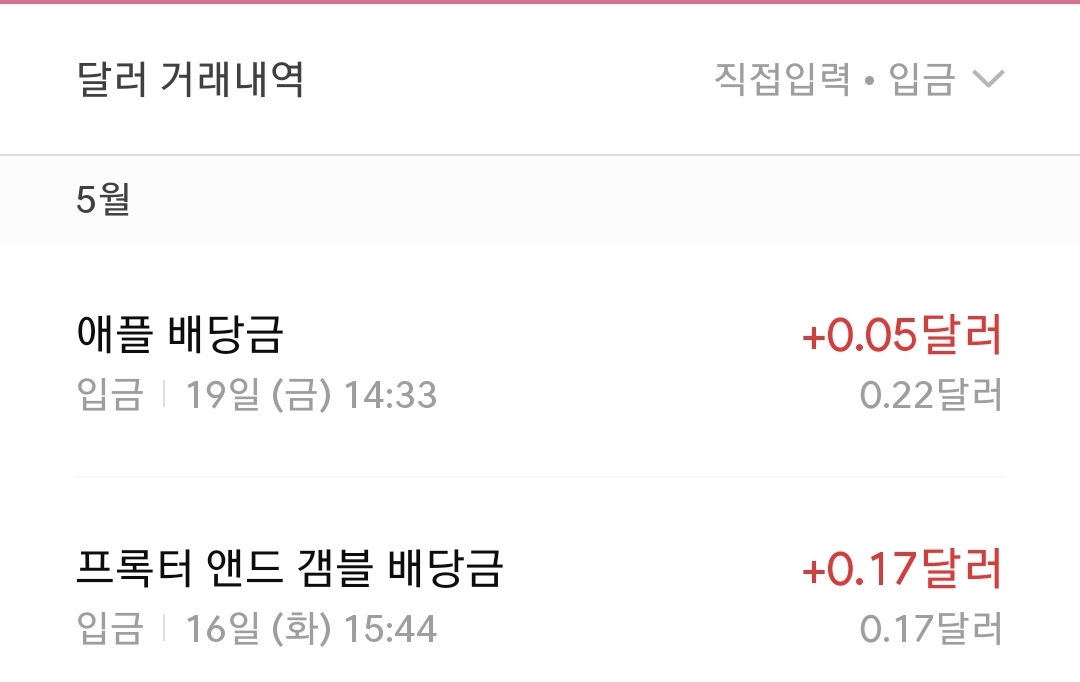 이번 주에는 애플, 프록터 앤드 갬블 배당금이 입금되었습니다. 애플은 0.05달러, 프록터 앤드 갬블은 0.17달러가 들어왔습니다. 배당으로 받은 달러는 앞에서 얘기했지만 오늘 바로 원화로 환전했습니다. 미국 주식은 종목별로 배당주기도 배당일도 다르다 보니 매주는 아니지만 매달 배당이 조금씩 들어오는 것 같습니다. 소액 투자자다 보니 배당이 정말 소액이지만 말입니다.