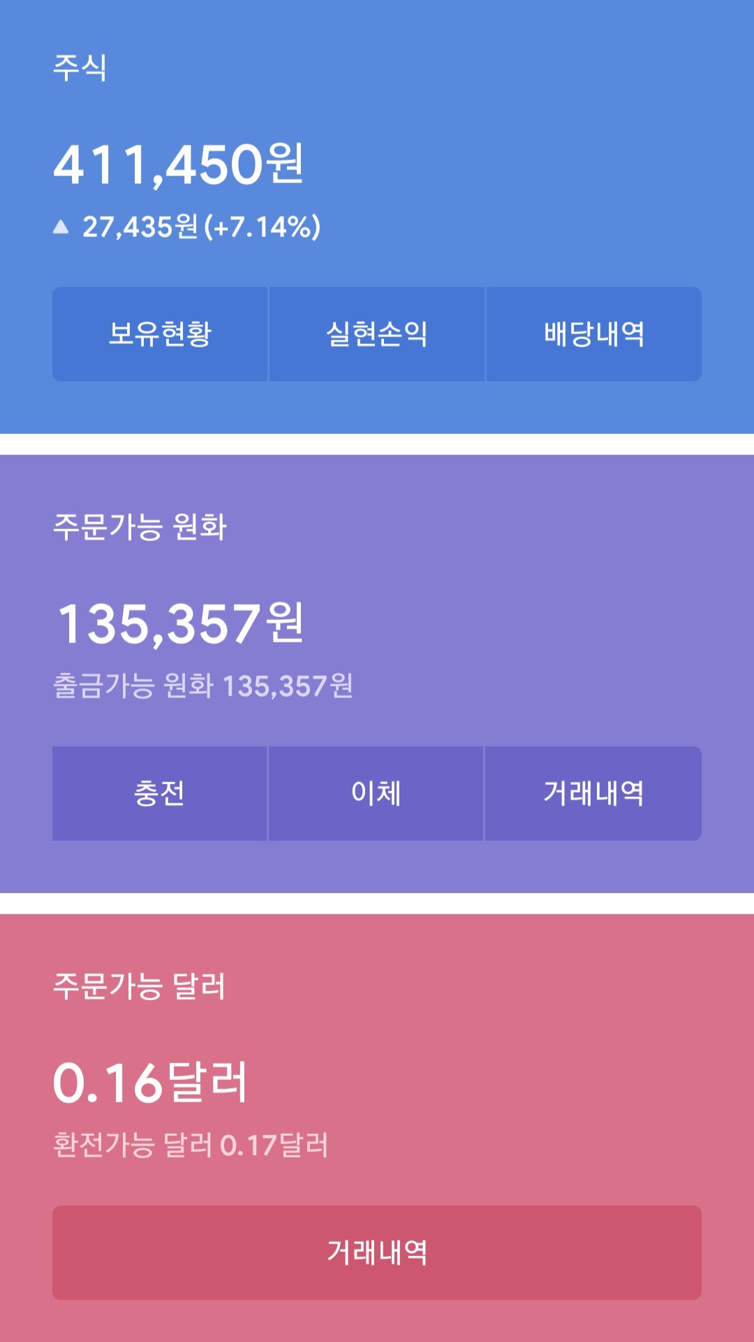 총자산 중에 주식 보유가 411,450원, 원화 보유 135,357원 그리고 달러 보유가 0.16달러입니다. 달러는 오늘 원화를 환전했습니다. 저번 주에 매도하고 입금된 현금이 있어서 원화 보유도 저번 주보다 조금 늘었고 보유주식이 상승해서 수익률이 저번 주보다 1% 정도 올랐습니다. 물론 다음 주는 또 어떻게 될지 모르는 일입니다.
