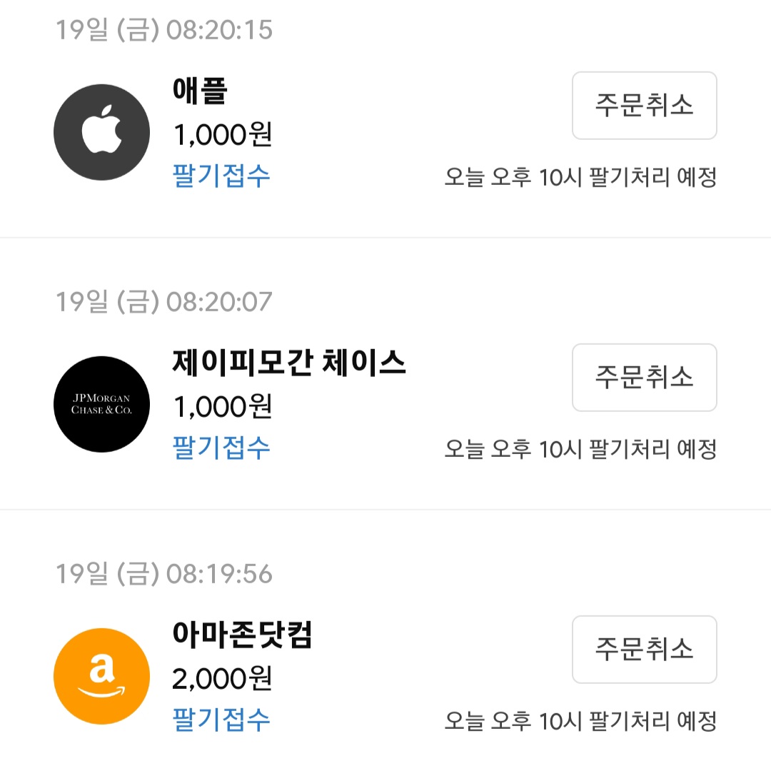 종목별로 정해놓은 기준 금액을 기준으로 상승하면 매도하고 하락하면 매수하는데 이번 주에는 매수할 만큼 하락한 종목이 없었습니다. 반면 애플, 제이피모간 체이스, 아마존닷컴은 상승해서 기준 금액에 맞추기 위해서 매도주문을 했습니다. 이번 주엔 아마존닷컴이 많이 올랐습니다. 3,000원 매도를 할까 하다가 일단 2,000원만 매도 주문했습니다. 아마존닷컴의 경우 얼마 전까지 계속 하락할 때 하락한 만큼 매수했는데 이제 조금씩 오르고 있습니다.