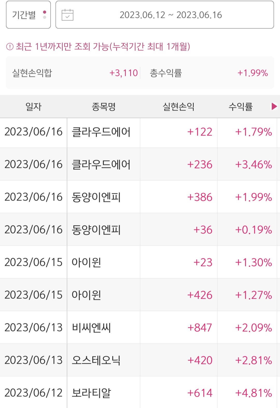 이번 주 수익률 1.99%로 실현손익 합은 +3110원입니다. 매도한 종목 중에 이번 주 이전에 매수한 종목도 있고 이번 주에 매수하고 매도하지 못한 종목도 있습니다. 이번 주 수익률은 이번 주에 매도한 수익률이라고 보면 됩니다. 오른쪽과 왼쪽 손익이 다른 건 오른쪽은 매도기준이고 왼쪽은 보유종목도 포함되기 때문입니다.