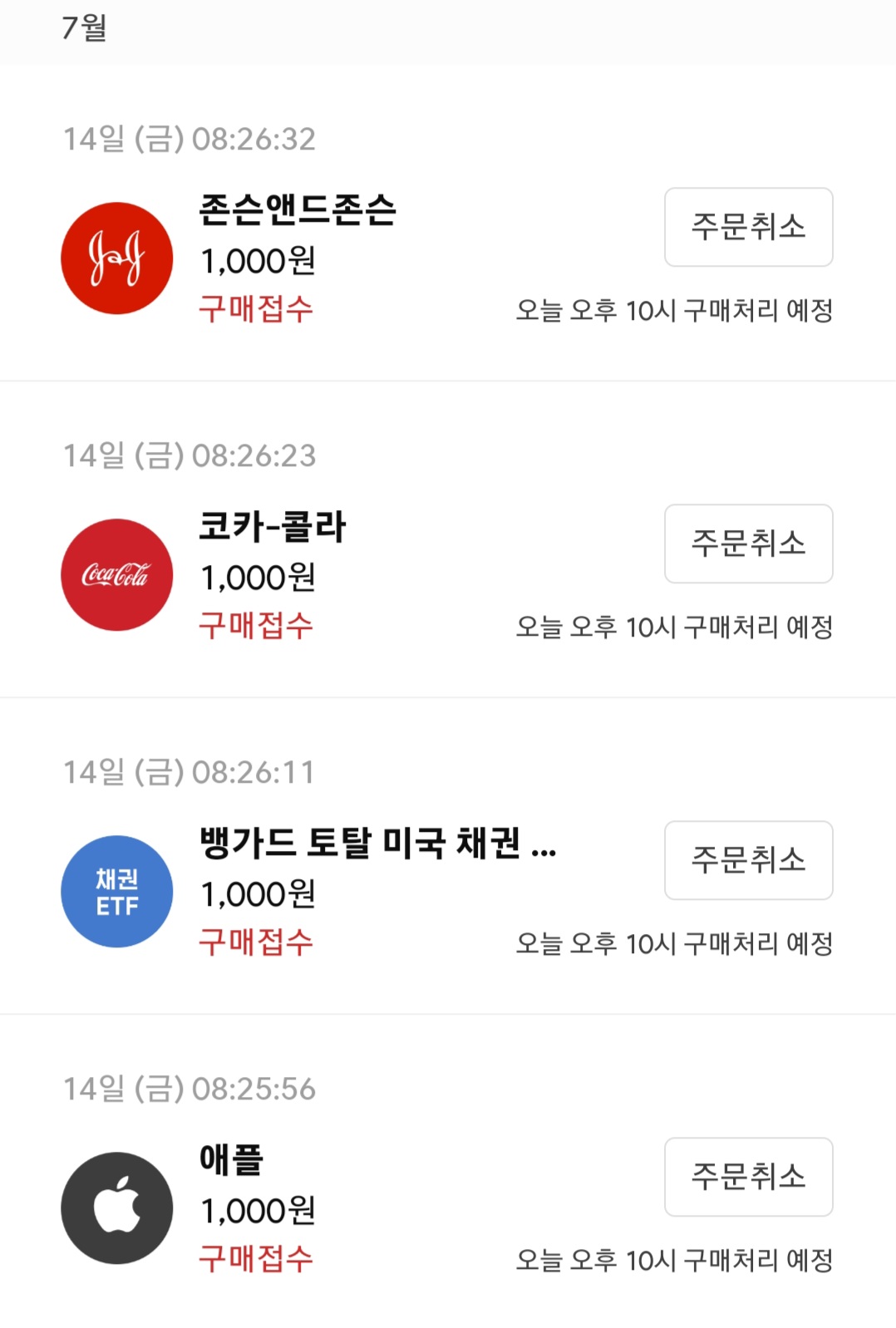 이번 주는 매도 없이 매수만 했습니다. 존슨앤드존슨, 코카콜라, 뱅가드 토탈 미국 채권 ETF, 애플 각각 1천원씩 매수했습니다. 최근 상승해서 매도하던 애플을 오랜만에 매수한 것 같습니다. 코카콜라는 최근 몇 번 매수한 기억이 있는데 주가가 주춤하고 있는 듯합니다. ETF는 당분간 보유하면서 상황을 보고 정리할 생각입니다.
