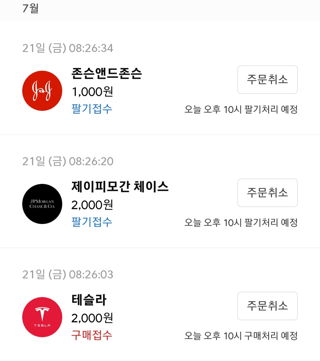 테슬라 2천원 매수 주문하고 제이피모간 체이스 2천원 매도 주문 그리고 존슨앤드존슨 1천원 매도 주문했습니다. 테슬라가 무섭게 상승하더니 2주 연속 하락해서 매수하고 있습니다. 테슬라도 변동 폭이 참 큰 종목인 것 같습니다. 상승할 땐 무섭게 상승하고 하락할 때도 꾸준히 하락하는 느낌입니다.