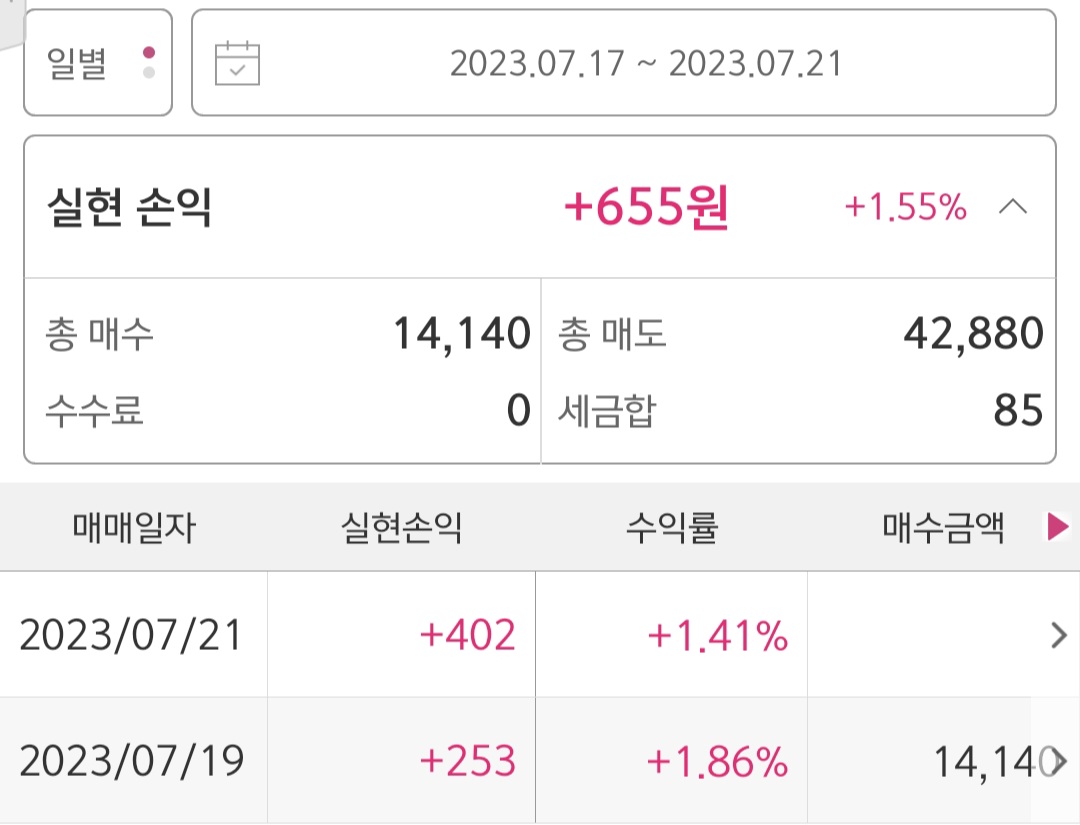 어쨌든 셋째 주 실현손익은 +655원이며 수익률은 +1.55%입니다.