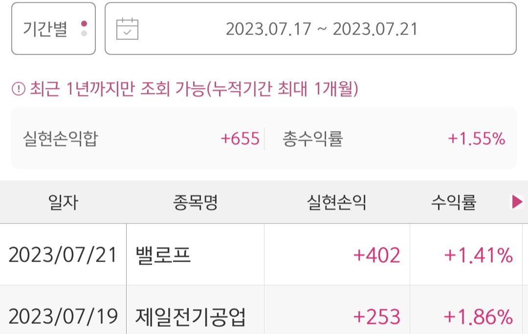 제일전기공업 2차 매매로 +253원 수익을 올렸고 밸로프는 1차 매매로 +402원 수익을 올렸습니다. 각각 수익률은 +1.86%와 +1.41%입니다. 제일전기공업 매매일지는 포스팅했는데 아직 밸로프 매매일지는 포스팅하지 않았습니다.