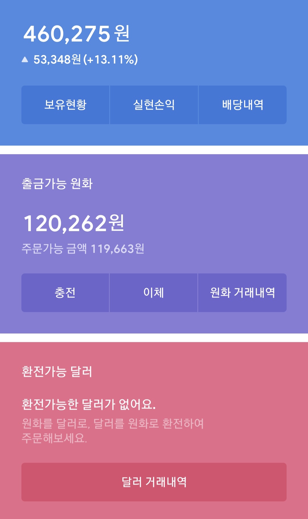 주식 보유 460,275원, 원화 보유 120,262원으로 총자산은 580,533원입니다. 미국 주식시장은 주춤했지만 총자산은 증가했습니다. 예전에는 주식시장과 비슷한 움직임을 보였는데 최근 시장 흐름과 반대로 움직이는 느낌입니다. 보유 종목이 바뀐 것도 아닌데 말입니다.  참고로 이번 주는 배당이 없어서 달러 보유는 없습니다.