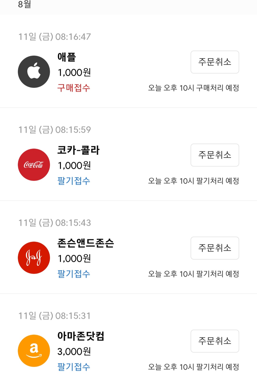 애플 1천원 매수주문을 하고 코카콜라 1천원, 존슨앤드존슨 1천원, 아마존닷컴 3천원 매도 주문했습니다. 이번 주 존슨앤드존슨, 코카콜라도 상승했지만 아마존닷컴이 많이 상승했습니다. 그리고 애플과 테슬라가 하락했는데 테슬라는 매수하지 않고 애플만 매수했습니다.