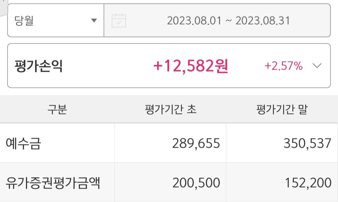 8월 31일 기준으로 평가손익은 12,582원으로 현금 보유 350,537원, 주식 보유 152,200원입니다. 평가손익은 현재 보유 중인 주식도 포함되기 때문에 위 손익금액과 차이가 있습니다.