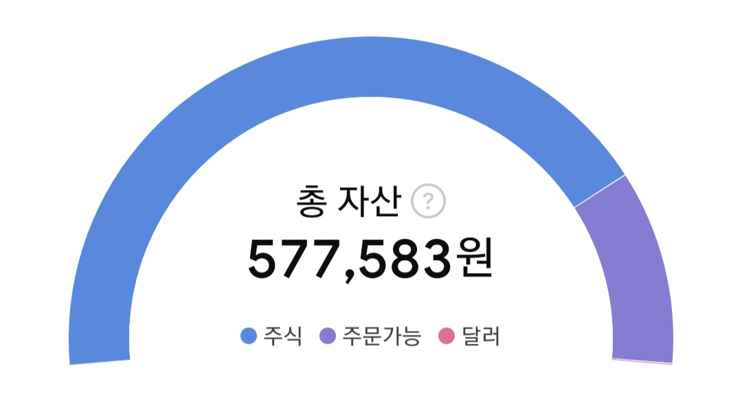 한국 시각 8월 4일 금요일 오후 기준 총자산은 577,583원이며 저번 주보다 8,695원 증가했습니다. 미국 주요 지수들은 하락했지만 제 총자산은 증가했습니다.