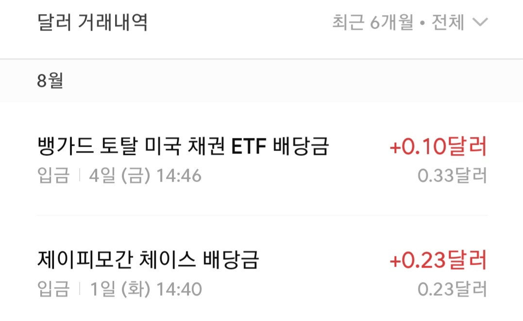 아주 소액이지만 오랜만에 배당금이 입금되었습니다. 배당은 뱅가드 토탈 미국 채권 ETF 0.10 달러, 제이피모간 체이스 0.23달러입니다. 배당금은 금요일 오후 원화로 환전했습니다.
