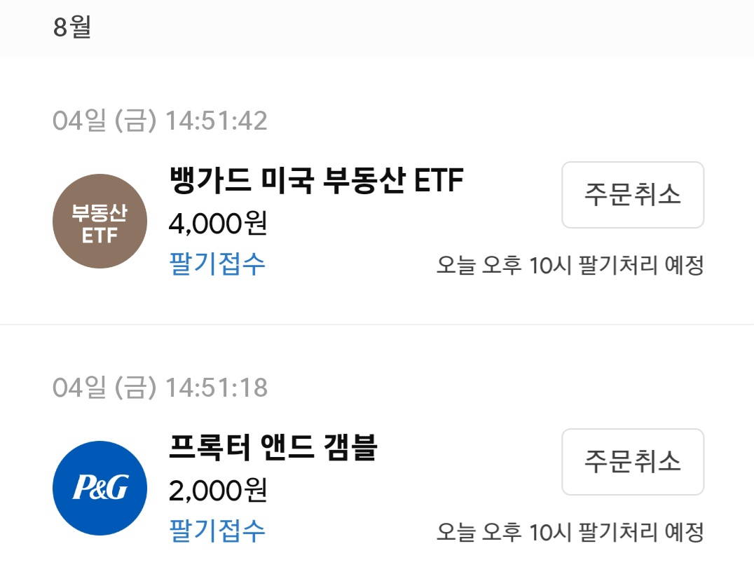 이번 주는 종목별로 큰 변동이 없었기에 매수할 종목은 없었고 매도할 종목은 2개 있었습니다. 프록터 앤드 갬블 2천원 매도, 뱅가드 미국 부동산 ETF 4천원 매도 주문했습니다. 프록터 앤드 갬블은 상승으로 매도했고 부동산 ETF는 비중을 줄이기 위해서 매도했습니다.