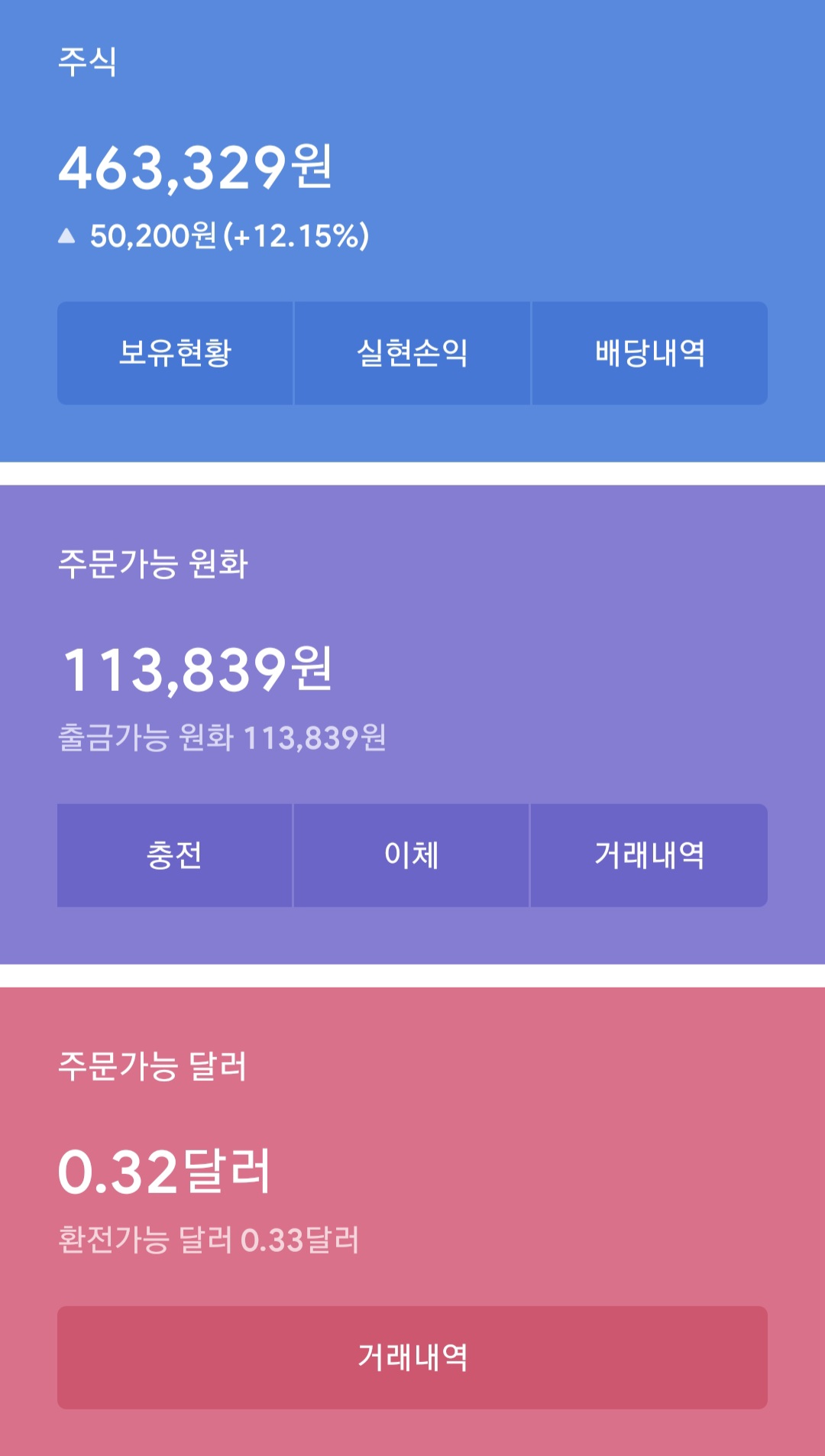 주식 보유가 463,329원으로 전주보다 증가했습니다. 최근 주춤했던 종목들이 조금씩 상승했고 최근 상승했던 종목들은 거의 하락하지 않고 유지했기 때문입니다. 원화 보유는 113,839원이며 이번 주는 배당금이 있어서 달러 보유가 0.32달러 있습니다.