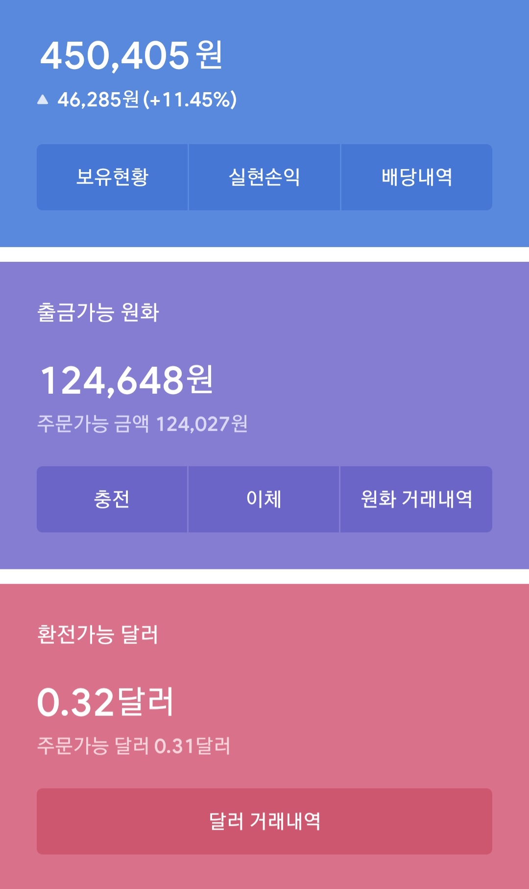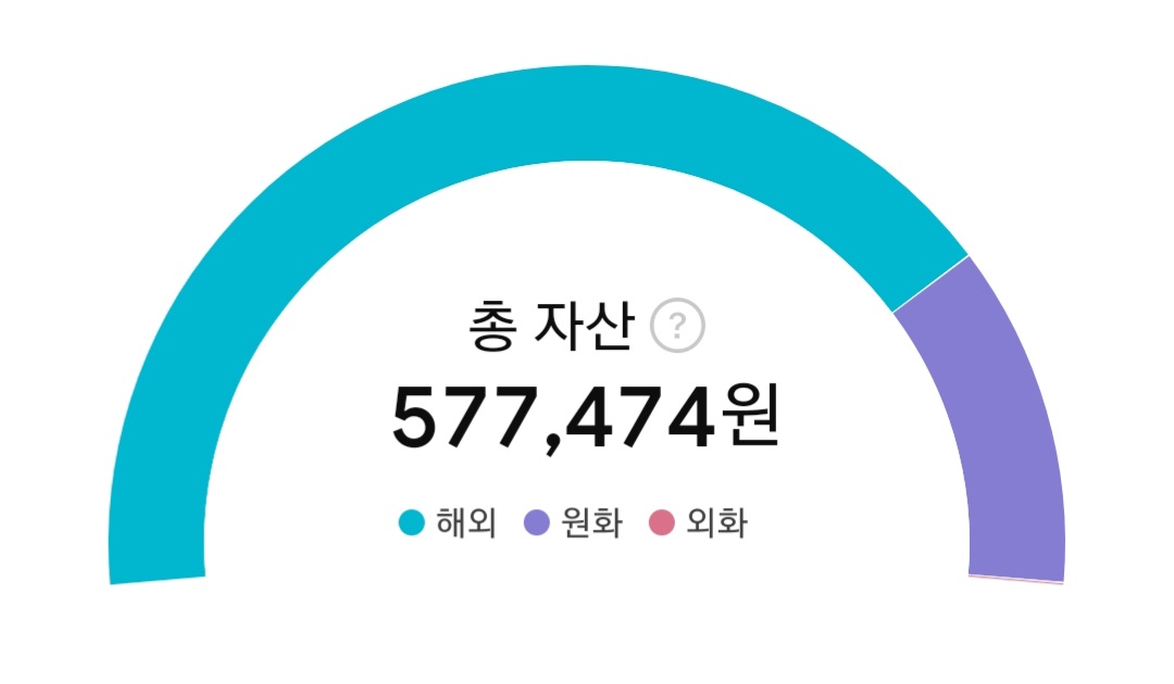 주식 보유 450,405원, 원화 보유 124,648원 그리고 달러 보유 0.32달러로 총자산은 577,474원입니다.