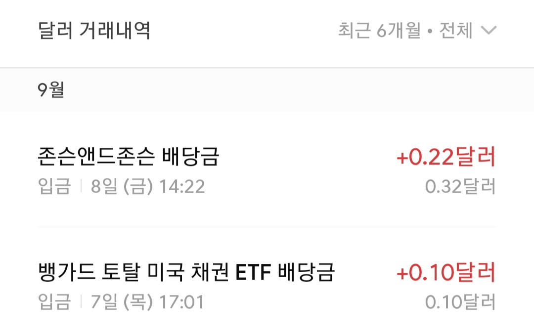 이번 주 배당금은 총 0.32달러가 입금되었습니다. 0.32가 아니라 32달러면 좋겠습니다. 32달러가 입금될 날이 올 거라고 믿습니다. 어쨌든 이번 주엔 존슨앤드존슨 0.22달러, 뱅가드 토탈 미국 채권 ETF 0.10달러의 배당을 받았습니다.