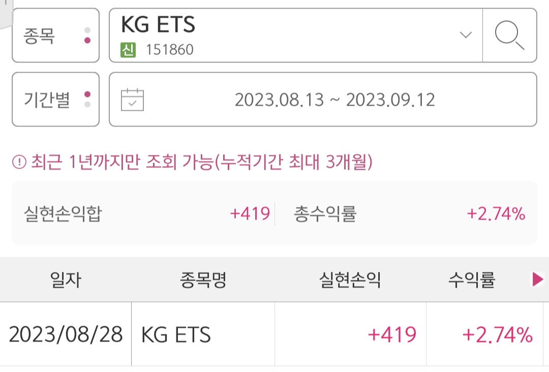 첫 매수 후 목표 수익률에 도달해서 추가 매수 없이 수익 실현했습니다. 수익률은 목표 수익률인 2.5%보다 조금 높은 2.74%이며 실현손익은 419원입니다.